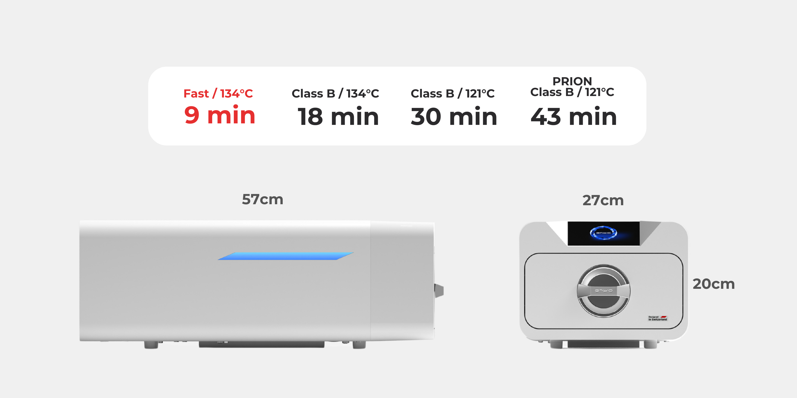 The Enbio PRO autoclave is 6 times more compact and 3 times lighter than a standard Class B autoclave. Sterilization including drying is on average 3.3 times faster.